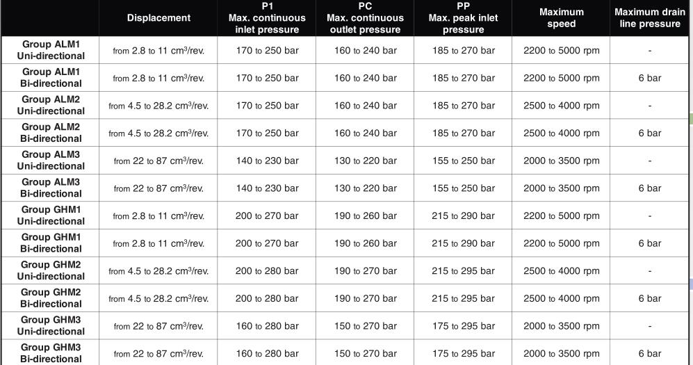 第一級(jí),低排量,高壓:1.1 cc/rev 至 3.2 cc/rev;P1 在 230 巴