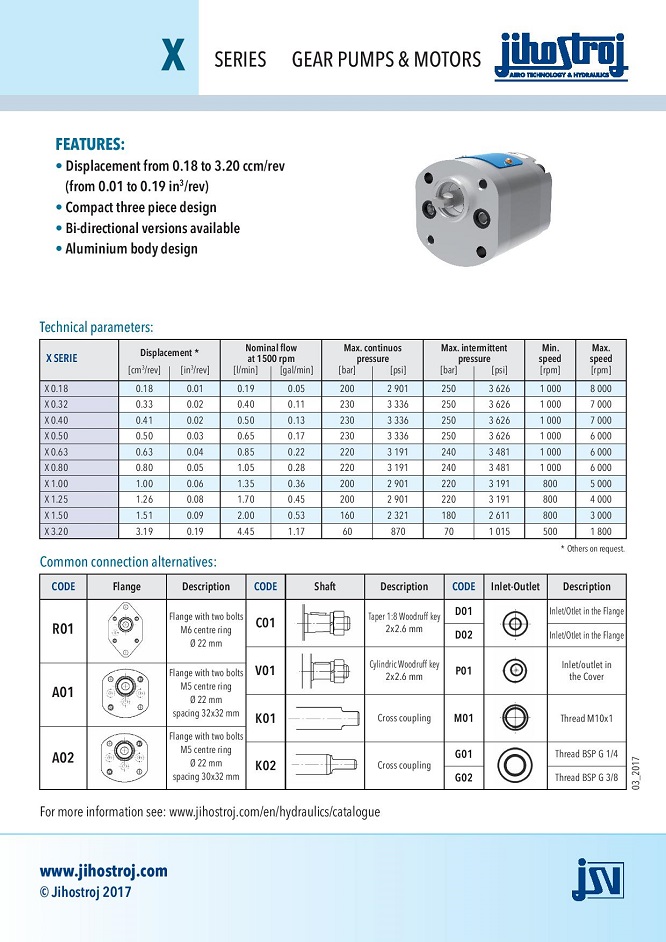 X系列JIHOSTROJ齒輪泵和電機(jī)設(shè)計(jì)用于性能非常低(高達(dá)2.3千瓦)的液壓系統(tǒng)。