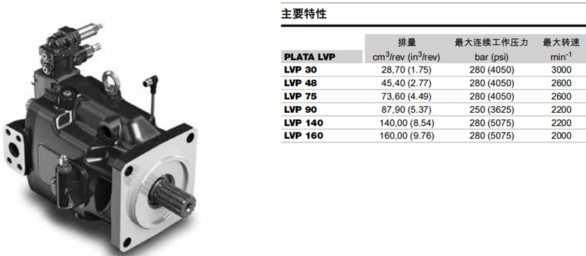 LVP系列變量軸向柱塞泵以其高效、可靠的性能和靈活的適應(yīng)性而著稱。該系列泵采用變量斜盤設(shè)計,適用于中高壓開式回路,排量范圍廣泛,從1.75 in/rev (28.7 cm/rev) 到5.36 in/rev (87.9 cm/rev),能夠滿足不同工況下的流量需求。其最大峰值壓力可達5075 psi (350 bar),最大轉(zhuǎn)速高達3000 min?1,確保了泵在高壓、高速條件下的穩(wěn)定運行。